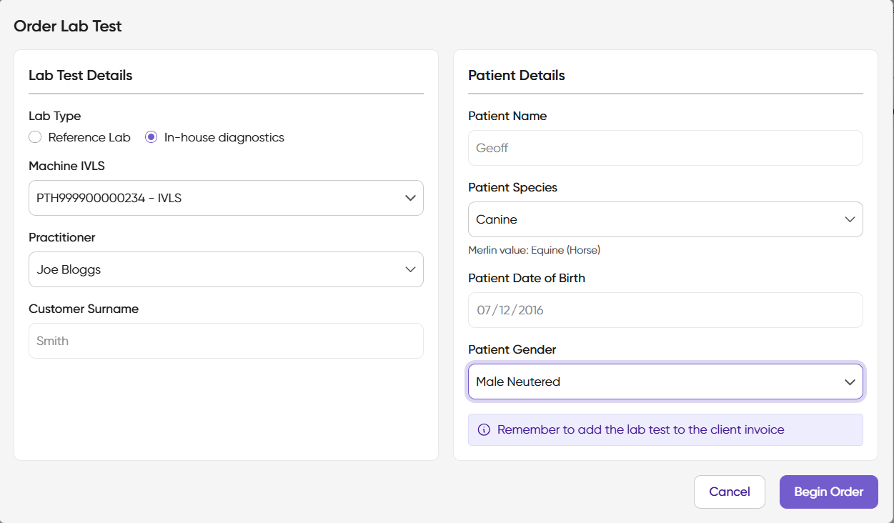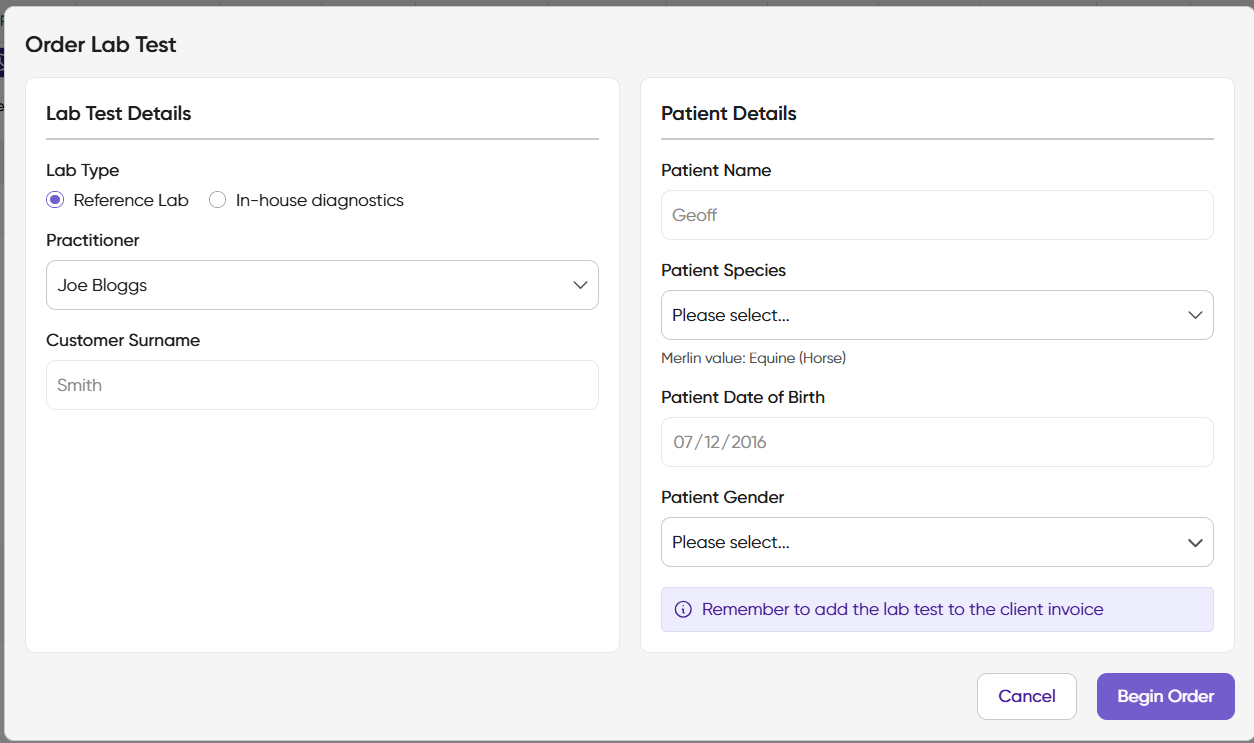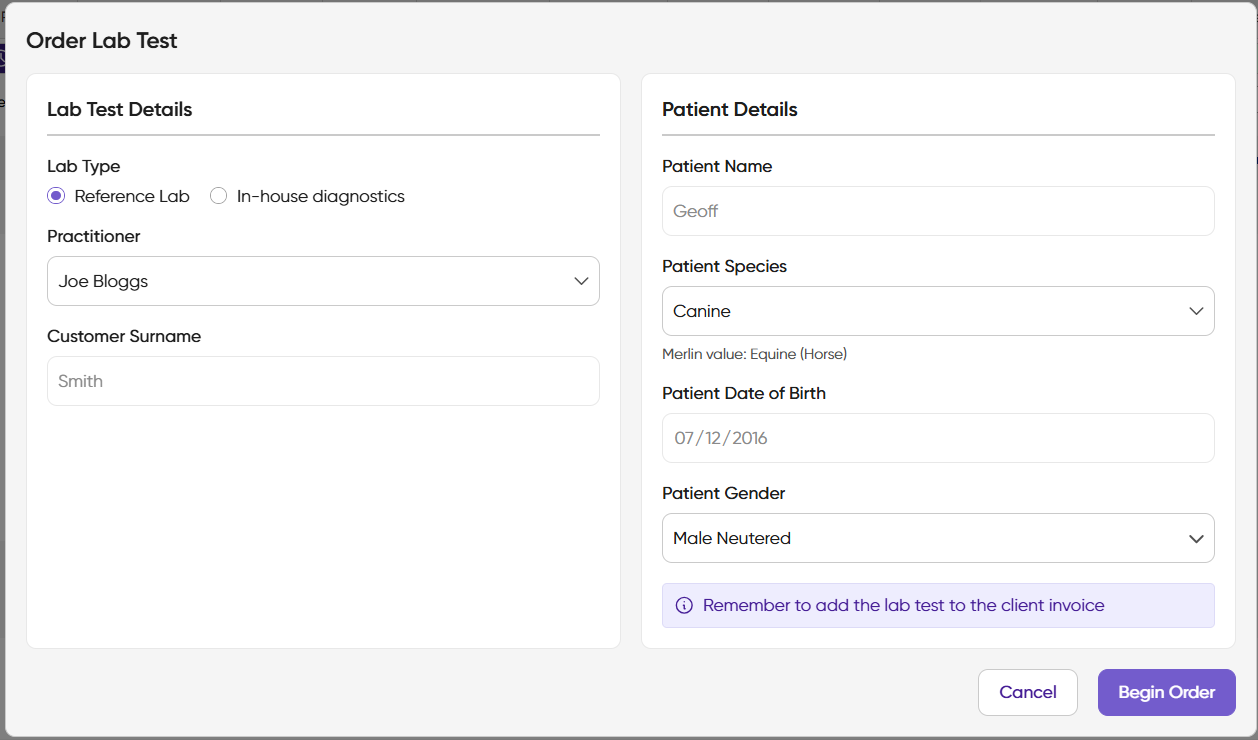 This functionality allows you to request both internal and external laboratory requests directly from VetConnect PLUS and results will be sent directly to your patient's History screen.