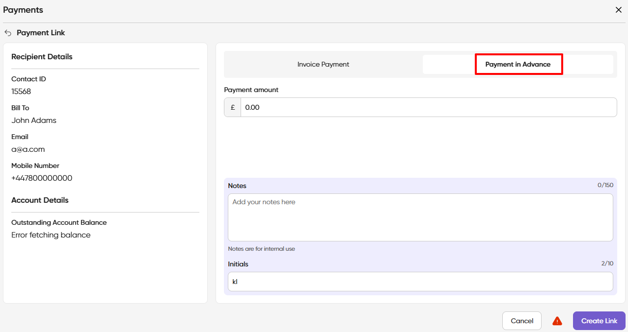 4. Enter the required payment amount, any notes and your initials then select Create Link