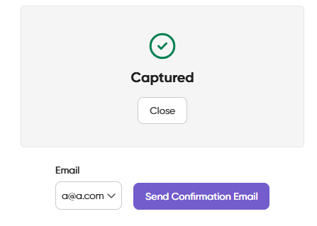 9. The terminal screen will display and indicate to you the stages of payment processing. Once the payment is completed you will see the following notification. If it is declined you may have the option to retry or ask your client if they have an alternative payment method If you require a receipt select Send Confirmation Email.