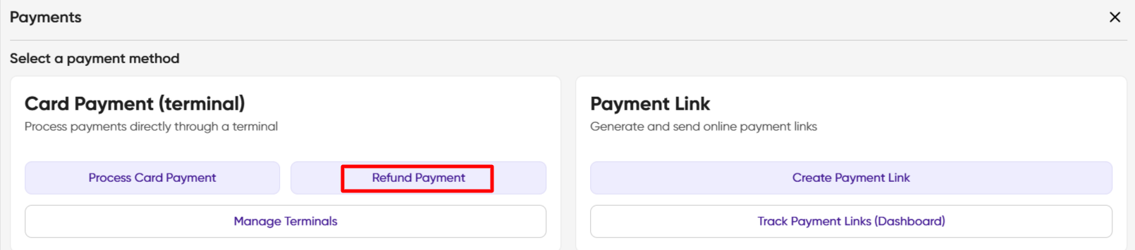 - Select Request POS Payment. You are presented with the Payments box, select Refund Payment