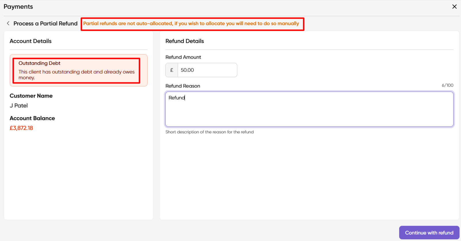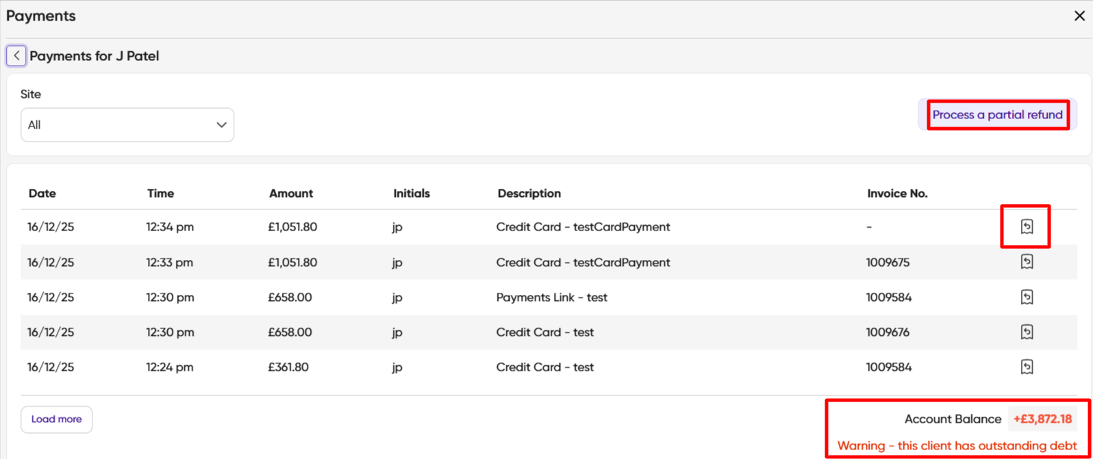- You are presented with the Payments screen, showing previous payments. NB The Account Balance is apparant and any warnings will show in red.