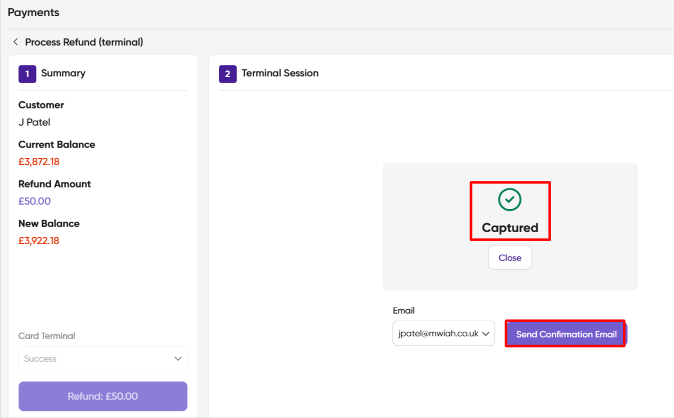 - You are presented with the Process Refund (terminal) screen. Once you have chosen your Card Terminal, click Refund which shows Captured once complete.