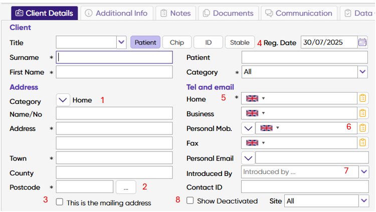 Registered Date | 4 | The date which the client first registered with the practice. By default it sets to the day you added the client details but can be amended. |