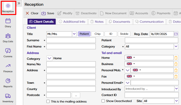 Client Registration is carried out on the Reception Screen using the same fields as those used to search for existing clients.