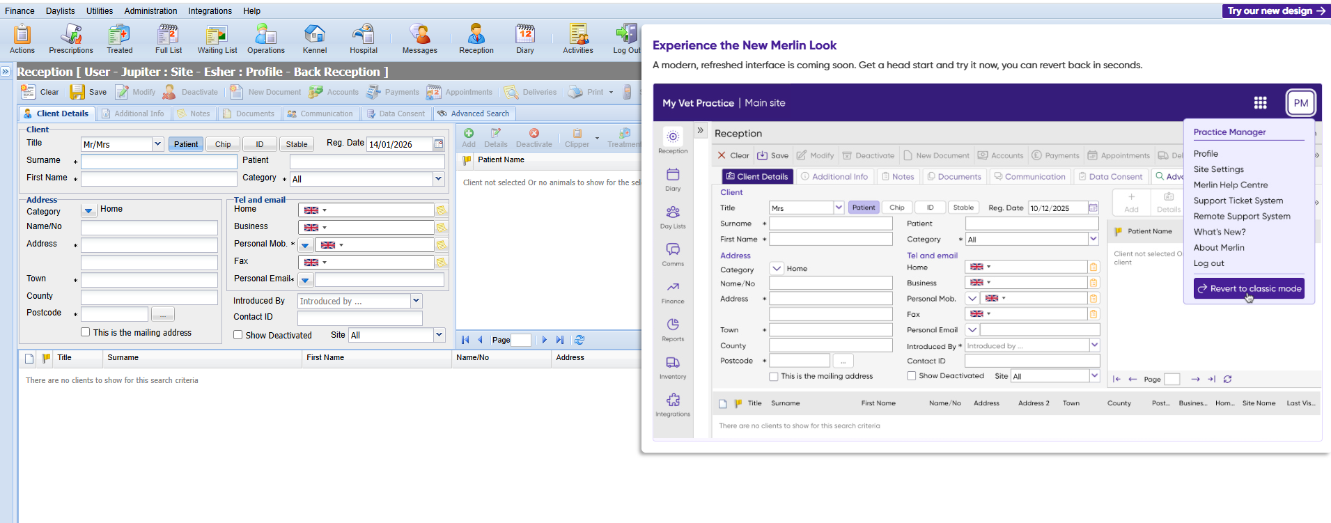 - The Client and Patient “pill” buttons are now clickable to navigate to reception or Treatment/History respectively.